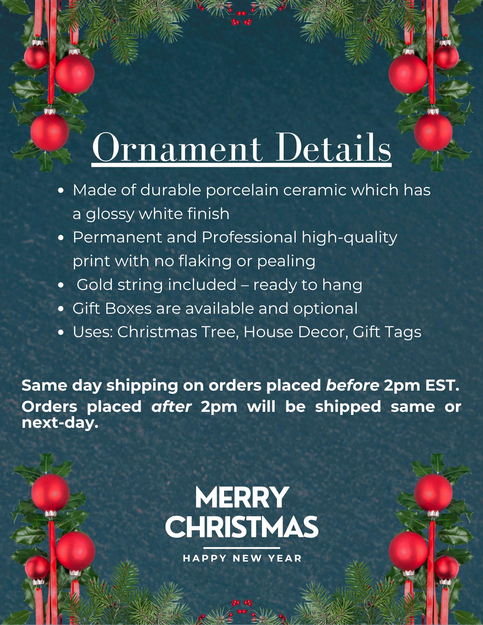 SAME DAY SHIPPING: This ornament will ship same-day for all orders placed by 2pm EST. Orders placed after 2pm EST will ship same or next day.