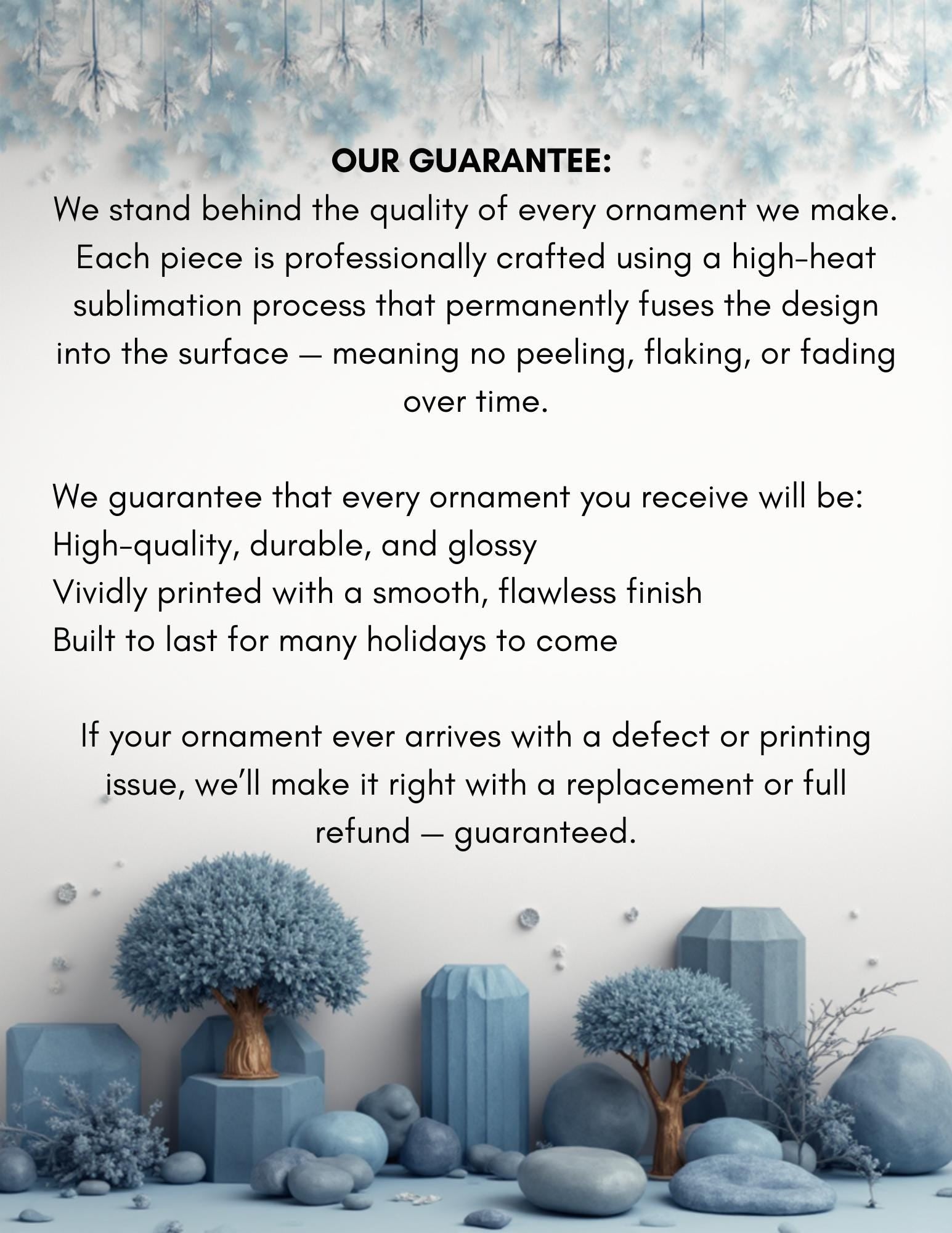 If your ornament ever arrives with a defect or printing issue, we’ll make it right with a replacement or full refund — guaranteed.