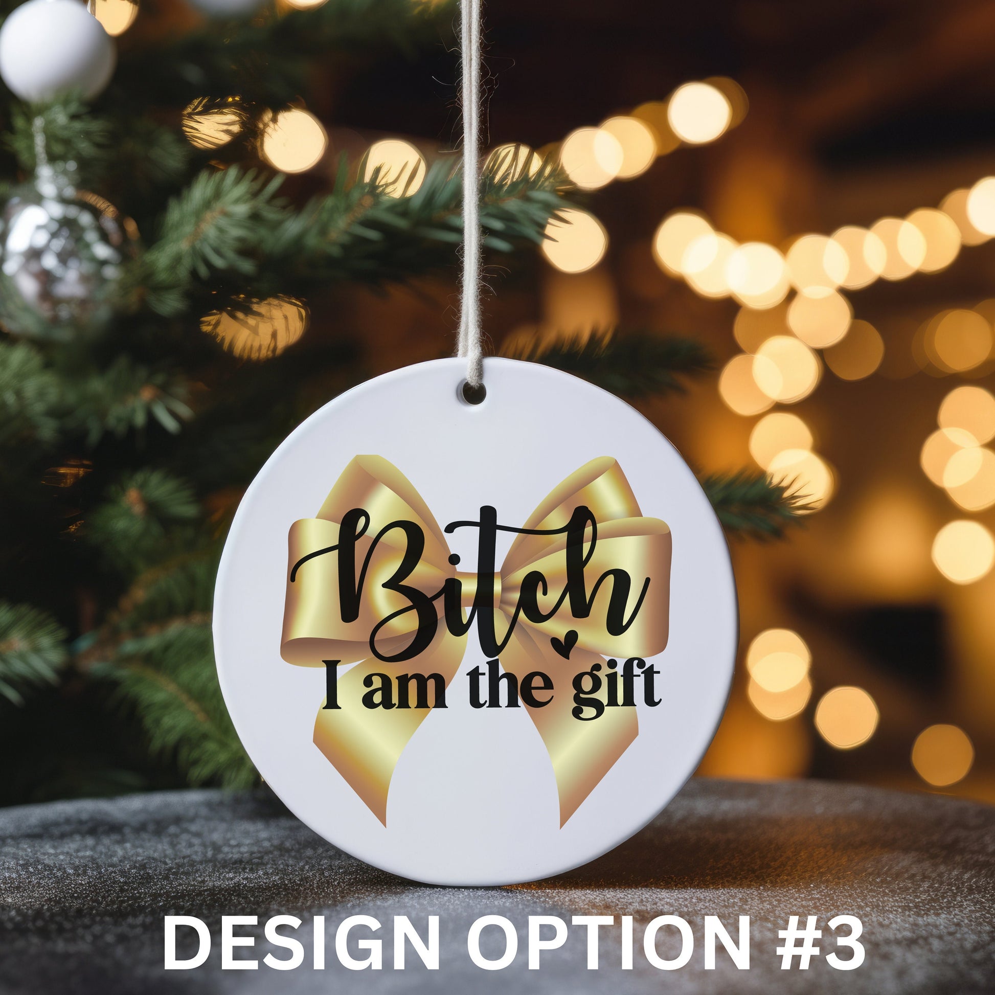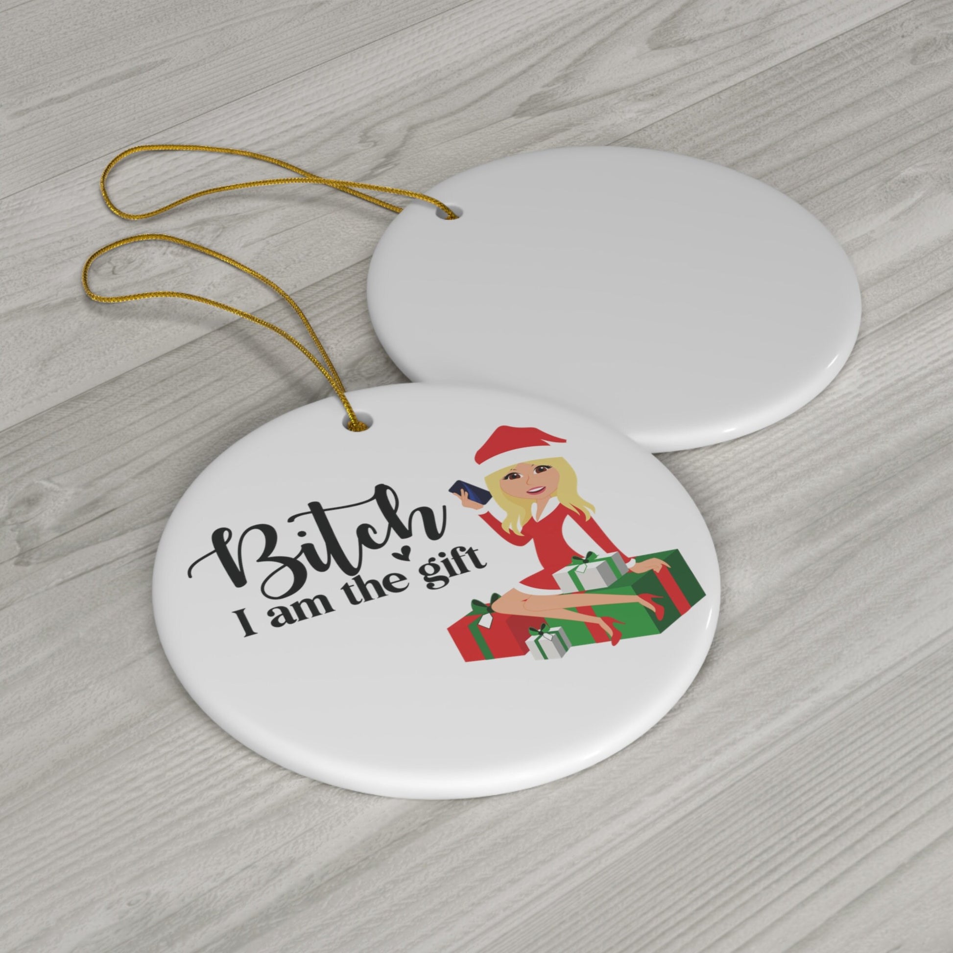 Our "Bitc* I am the Gift" ornament is the perfect funny adult gift to give friends or family to add a little humor to your Christmas tree!