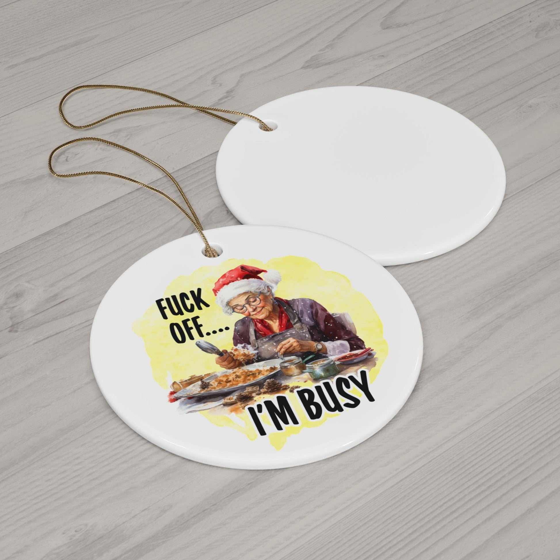 Reads: Fu*k Off I'm Busy - Material: Ceramic - Gift Box: Optional w/ ceramic ornament